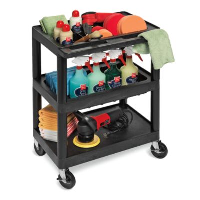The industry-leading auto detailing cart. This auto detailing and car wash cart is ideal for car washes and high volume detail shops that need extra portable storage space. Perfect to stow: towels, applicators, sponges, gallons of chemicals, trash receptacle and many more critical items that must be at your fingertips when performing washing, drying and detailing services.